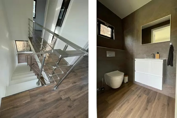 “Nadat het contact was gelegd met Dave, ging het zo goed als vanzelf en zijn we ook niet meer verder gaan kijken bij andere partijen,” vertelt de klant. “Alles is via (video)bellen en e-mail gegaan. Van het eerste kennismakingsgesprek tot aan het uitzoeken van de juiste producten,” laat hij weten. Dave nam de klant mee in het uitgebreide assortiment van Tegelmegashop en beide partijen kwamen relatief snel tot een akkoord over wat het ging worden. “We wisten al snel wat wilden en met hulp van Dave was het allemaal snel geregeld,” laat de klant tevreden weten. Snel, maar ook zorgvuldig, waarbij er bijvoorbeeld goed gekeken werd dat de tegels aansluiten bij het sanitair. “Telkens als we een vraag hadden, werden we zeer professioneel en snel te woord gestaan, Zelfs in het weekend of in de avond!” Ze kwamen uit bij onder andere de Howen Walnut 60x120, Floresta Brown 20x120 en badkamermeubels van Tieme.