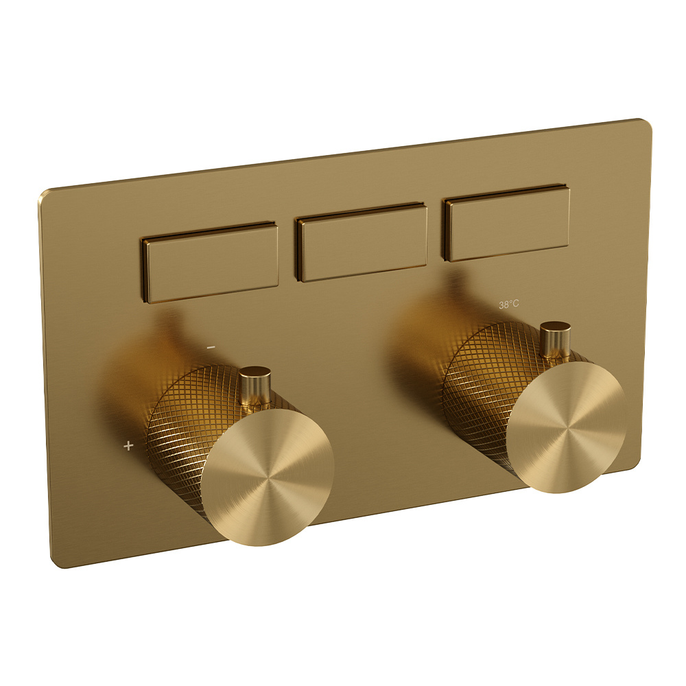 Maak uw ruimte compleet met de Goud geborstelde PVD inbouwthermostaat met drukknoppen (3-weg). Dit product combineert kwaliteit en functionaliteit, waardoor het een uitstekende keuze is voor elke ruimte.
