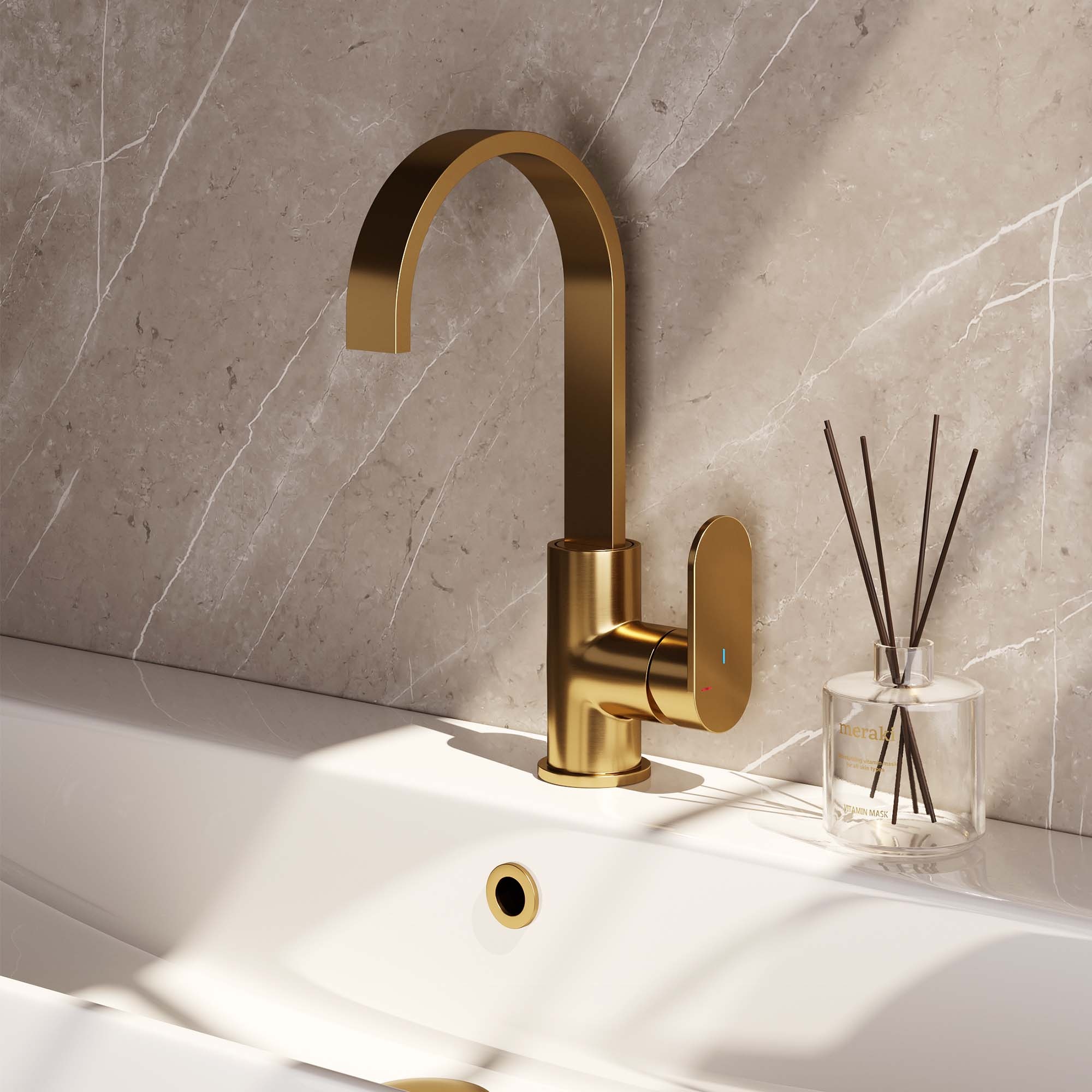 Maak uw ruimte compleet met de Gold Edition hoge opbouw wastafelmengkraan met draaibare platte uitloop, model C goud geborsteld PVD. Dit product combineert kwaliteit en functionaliteit, waardoor het een uitstekende keuze is voor elke ruimte.