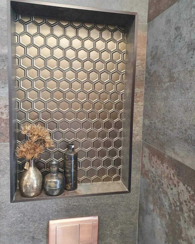 TerugHomeTegel toepassingenWoonkamer tegelsHoutlook woonkamer tegelsMozaiek Barcelona Metallic Brons 5,1x5,9