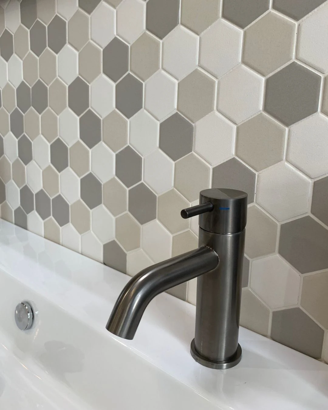 Groot, mat, zeshoekig mozaïek in een witte mix, uit de London mozaïekcollectie van The Mozaïek Factory.