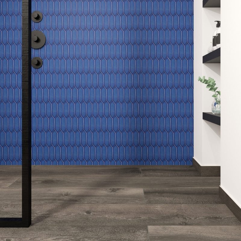 BeschrijvingGlanzende blauwe mozaïektegel met een speelse zeshoekvorm, gemaakt van geglazuurd porselein. Deze piketvormige mozaïek is zeer geschikt als wandtegel en kan zowel horizontaal als verticaal worden toegepast.