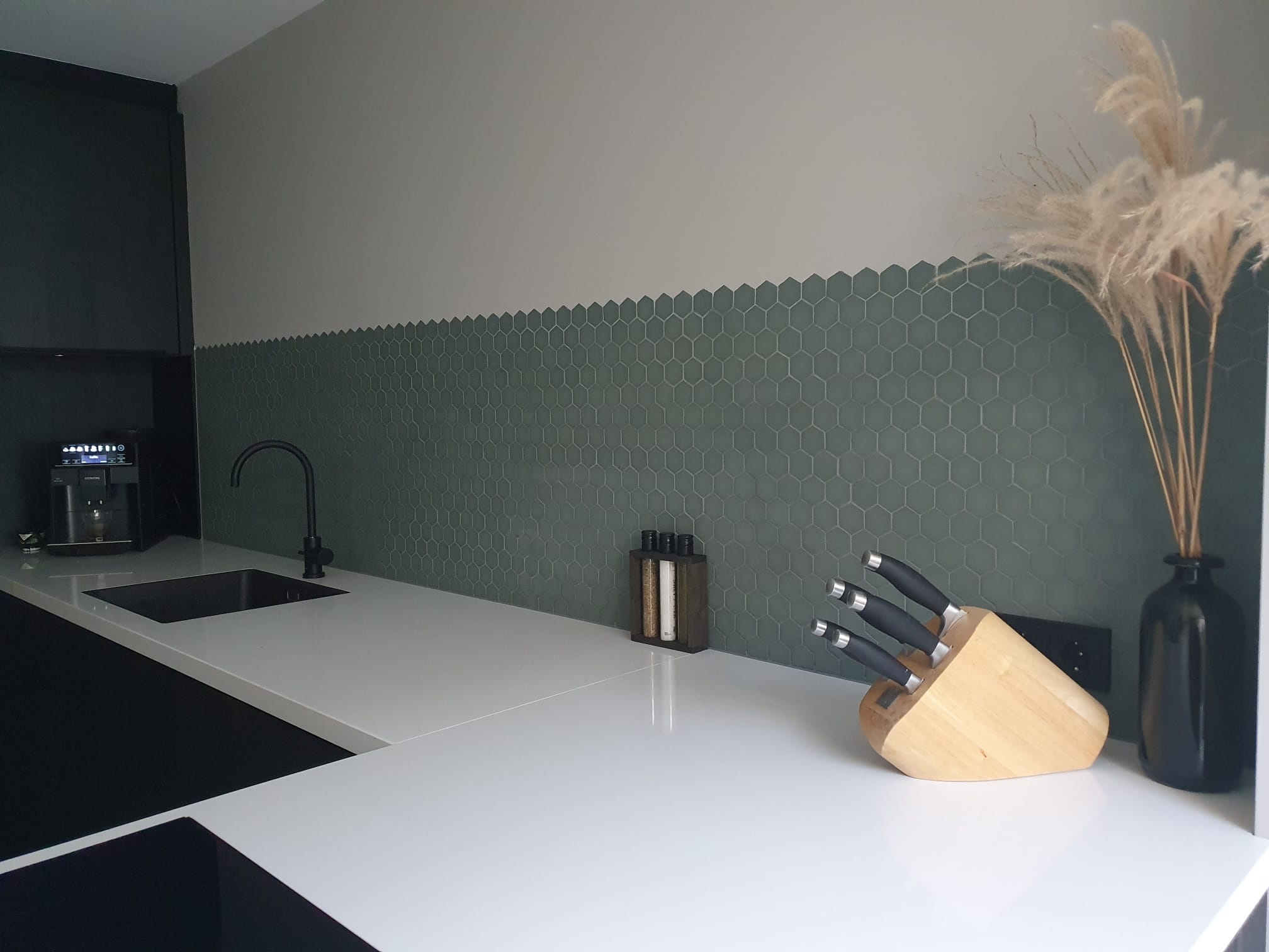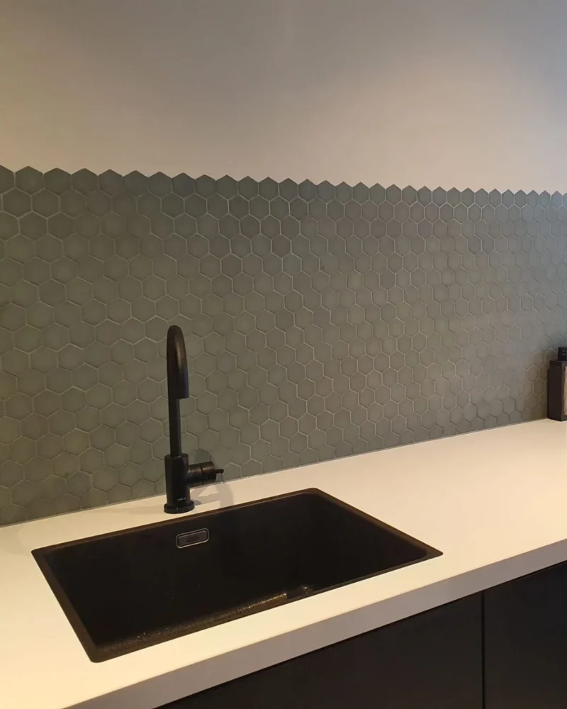 Om een groot verschil in de voegmaat binnen het vel op te lossen, kunt u een individueel Valencia mozaïektegeltje iets anders positioneren. Snijdt hiervoor de verbindende lijmstukken rondom het mozaïektegeltje los en herplaatst de hexagon op de gewenste plek.