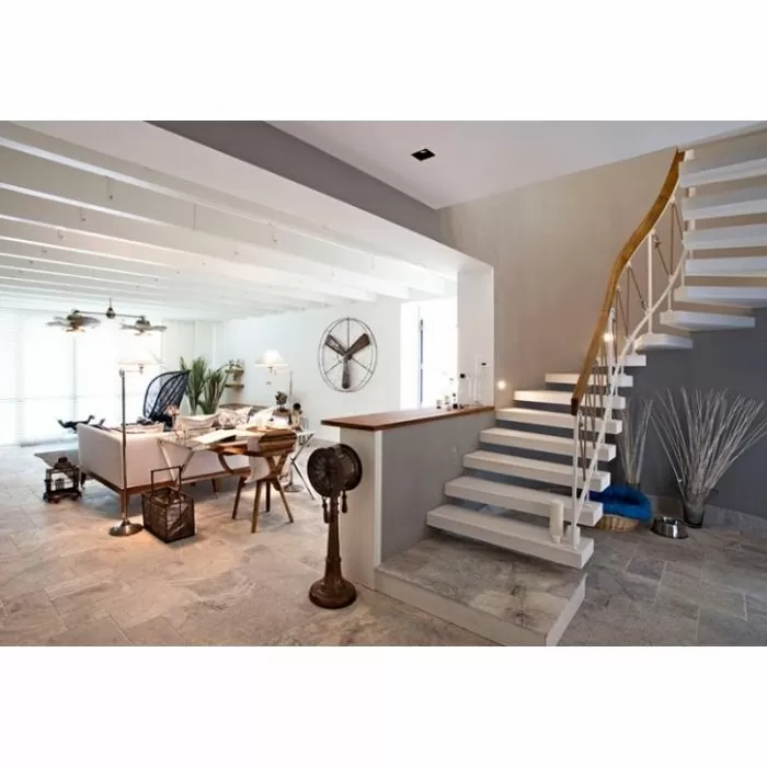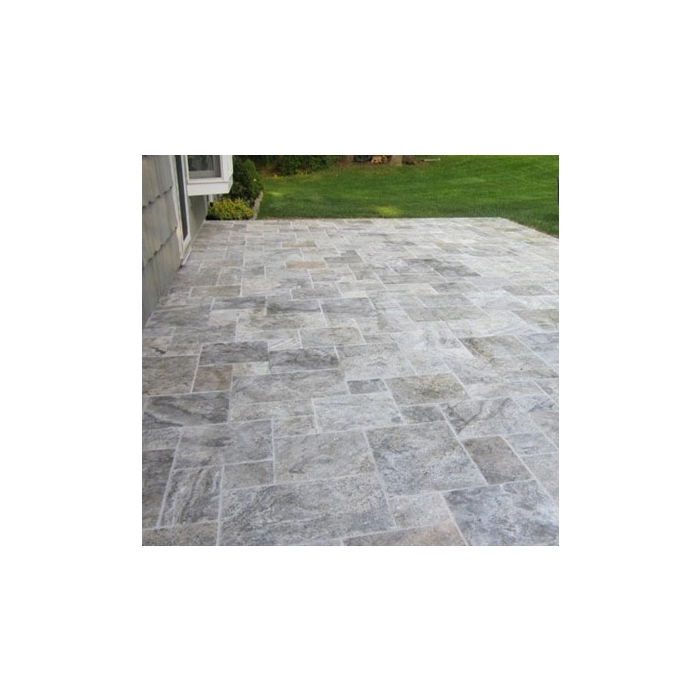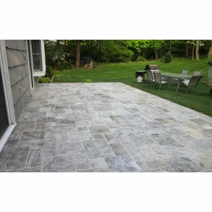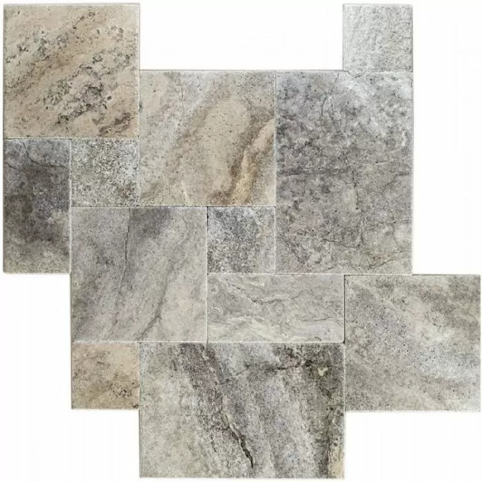 Travertin is een kalkhoudend, sedimentair gesteente. De typische gaatjes ontstaan door het wegrotten van plantenresten die door het sediment opgesloten raken. Dit ongestopte travertin heeft een gezoet oppervlak en verouderde kanten door middel van trommelen.