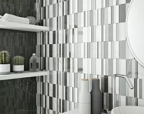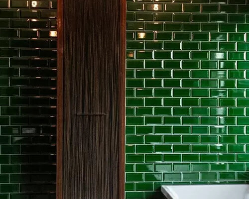 Spiegels zijn een cruciaal element van Art Deco en helpen om een donkere hoek op te lichten. Zodoende dat er qua tegels ook vaak gekozen wordt voor tegels met een spiegelend effect. Tegels die licht reflecteren zonder een volledige weerspiegeling te geven. Een bepaald soort tegel die dat goed doet is de metro tegel, die juist gemaakt is om licht rond te spelen in een ruimte. Mix deze tegels met accenten van chroom om de 1930’s invloed van Art Deco te vieren. Zorg voor de een donkere kleur aan de muur, zodat deze weerspiegelende tegels er nog meer tussen uit springen.